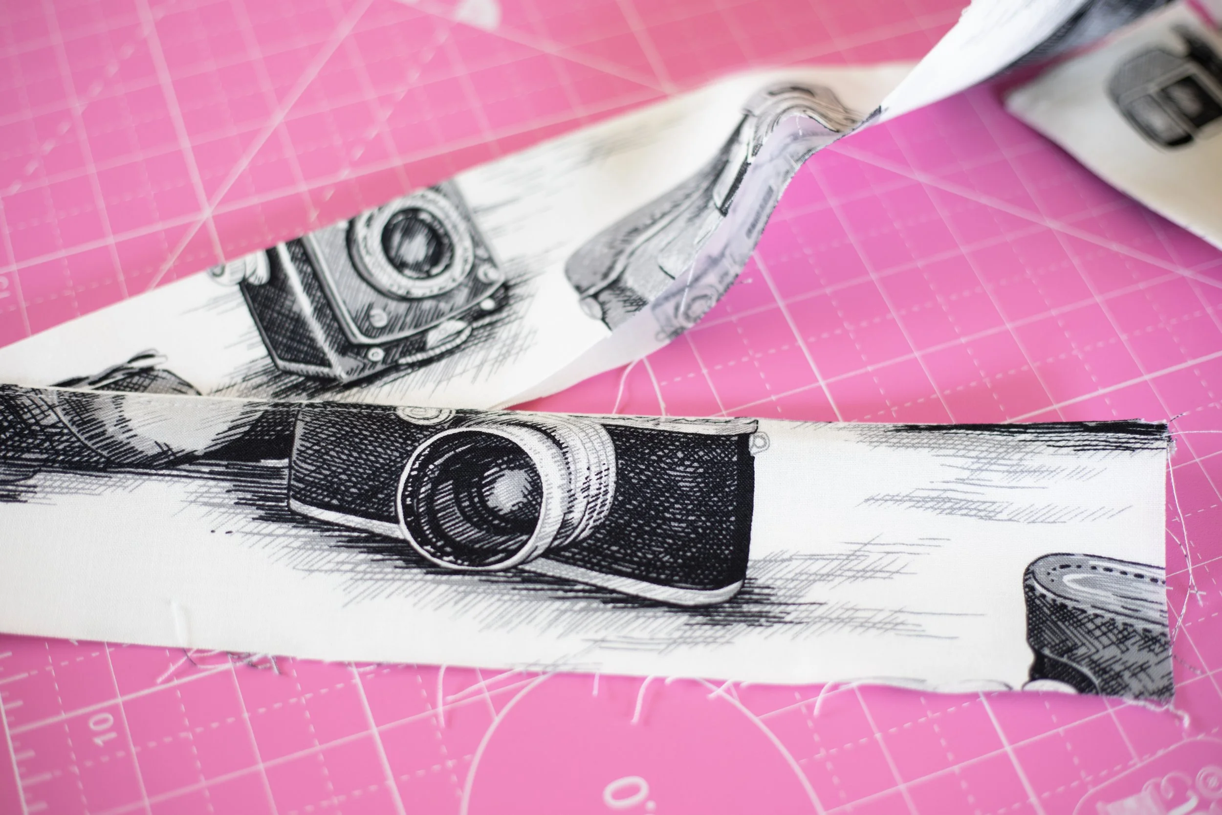 Novelty prints are my favorite. So, when I saw this fun camera fabric at Hobby Lobby, I bought the remainder of the bolt. I planned on making a skirt and hoped I had enough left for a few other small projects. Hint: I’m going to make another bag using leftover pieces.